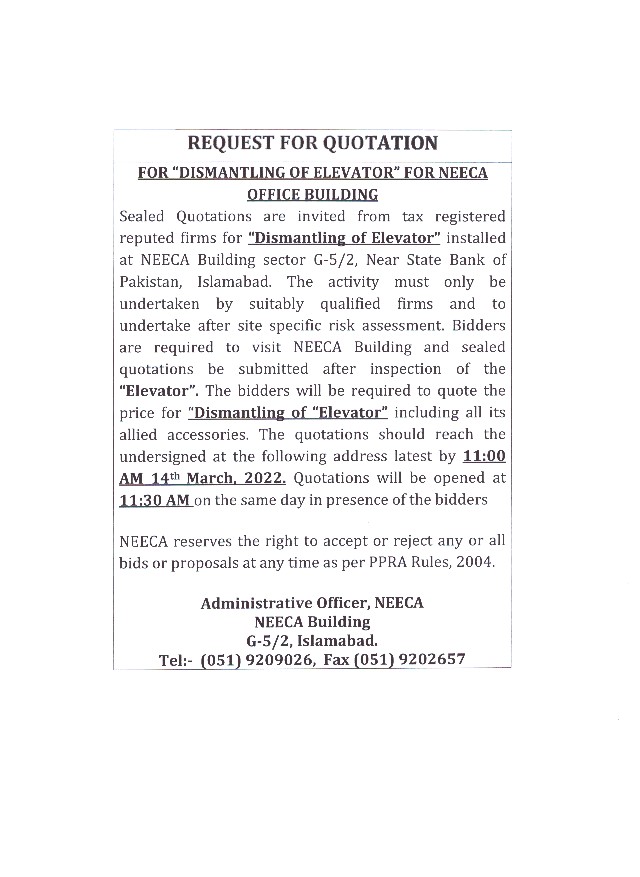 Tender Notice for Dismantling of Elevator for NEECA Office Building