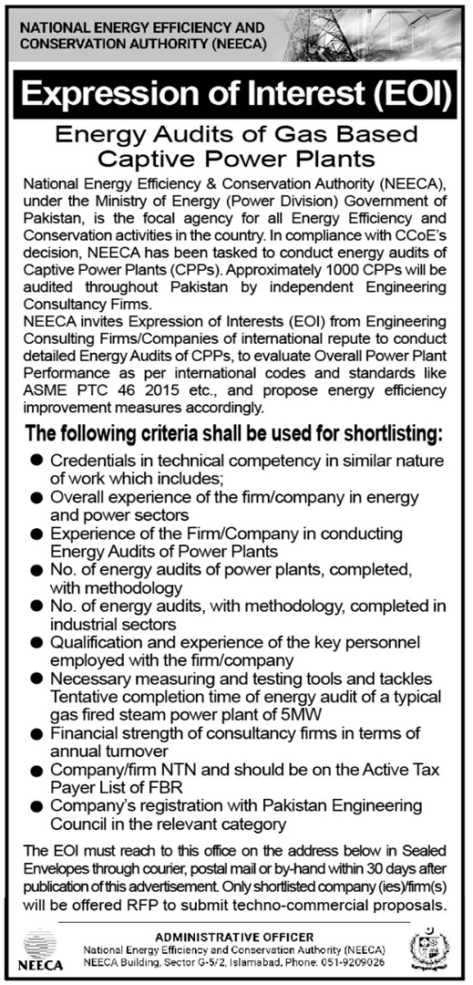 National Energy Efficiency and Conservation Authority (NEECA) is conducting energy audits of Captive Power Plants (CPPs) through independent energy audit consulting firms across Pakistan. NEECA has been assigned this task by the CCoE in its meeting held on 4th June 2020 and intimated to NEECA by the Petroleum Division, Ministry of Energy on 30th July 2020. The aim of these energy audits is to promote efficient use of fast declining indigenous natural gas resources and utilize the excess power in the national grid.